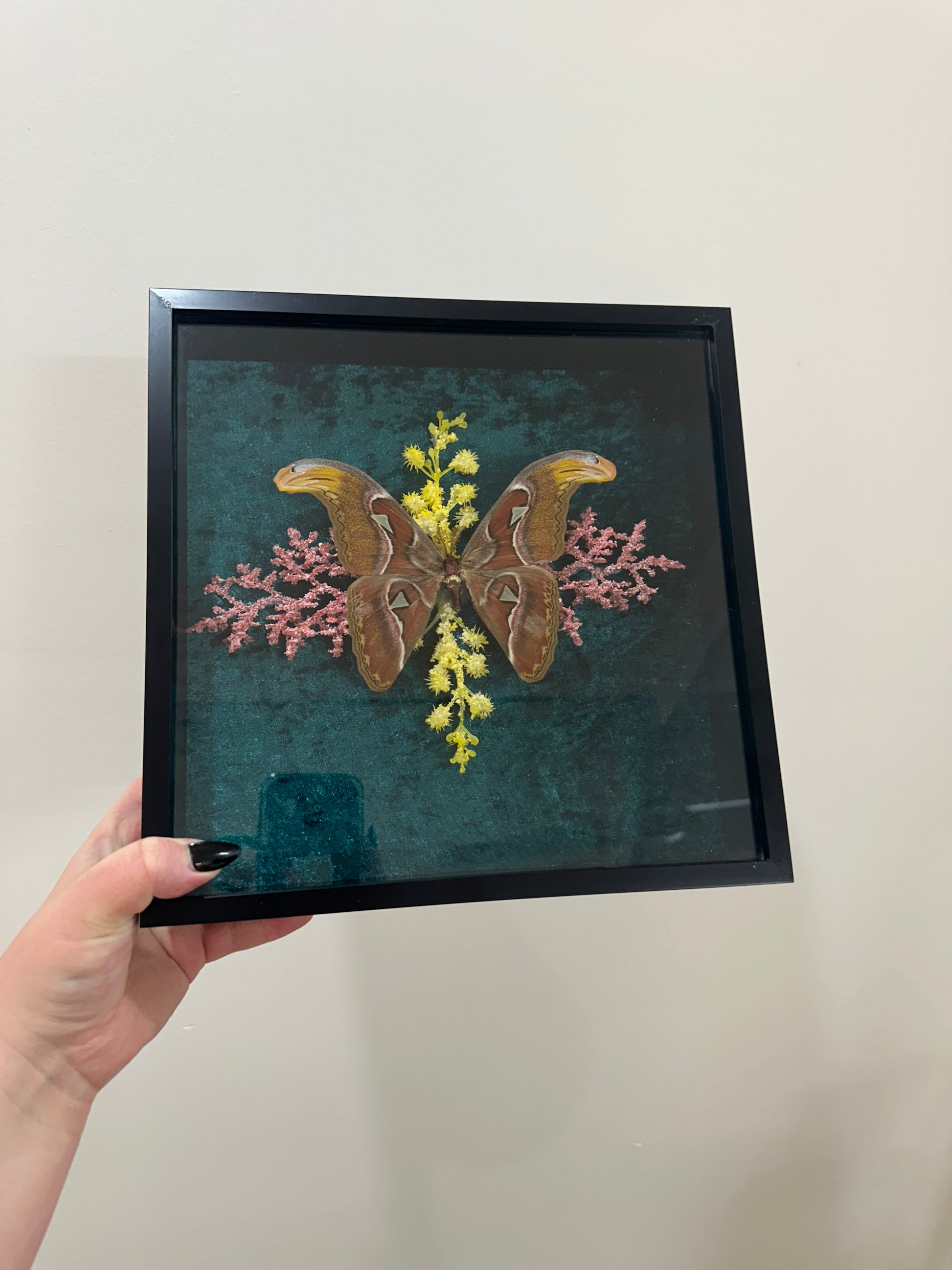 Set against a moody, textured teal background, the moth is thoughtfully paired with preserved botanical elements in soft yellow and blush tones, creating a balanced, almost symmetrical composition that feels both organic and artful. The deep shadow box frame adds dimension and protection, while the sleek black finish gives it a modern, gallery-style presence.
